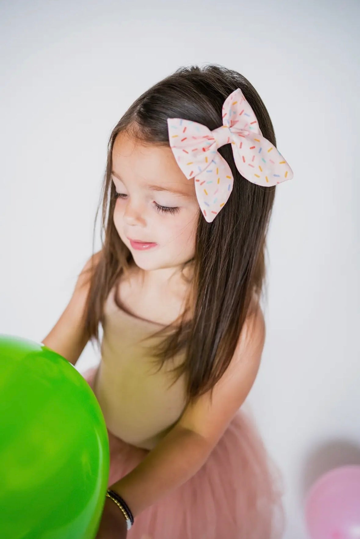Schattige sprinkles-strik met vrolijke kleuren, perfect voor een speelse en feestelijke look. Gemaakt van zachte stof en verkrijgbaar met krokodillenklem of haarband-elastiek. Ideaal voor verjaardagen, fotoshoots of elke dag een beetje extra fun. Verkrijgbaar in meerdere maten.