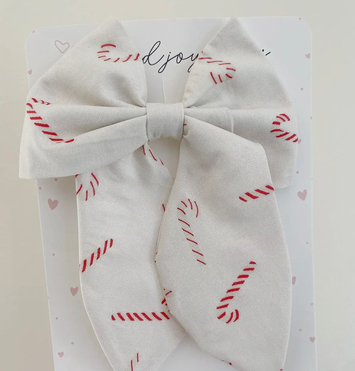 Feestelijke candy cane strik met zachte witte stof en rode details. Perfect voor de feestdagen, kerstfoto’s of een schattige winterlook. Je kunt kiezen uit een stevige krokodillenklem of een comfortabel haarband-elastiek. Verkrijgbaar in meerdere maten.